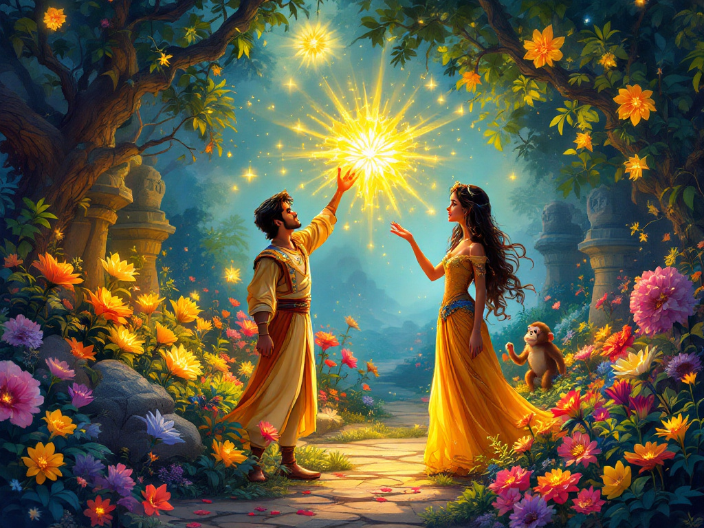 Аладдин согласился, и они вместе произнесли свое желание. Цветок засветился ярче, и вдруг весь сад засиял волшебным светом. Когда свет угас, они поняли, что их желание исполнилось.
